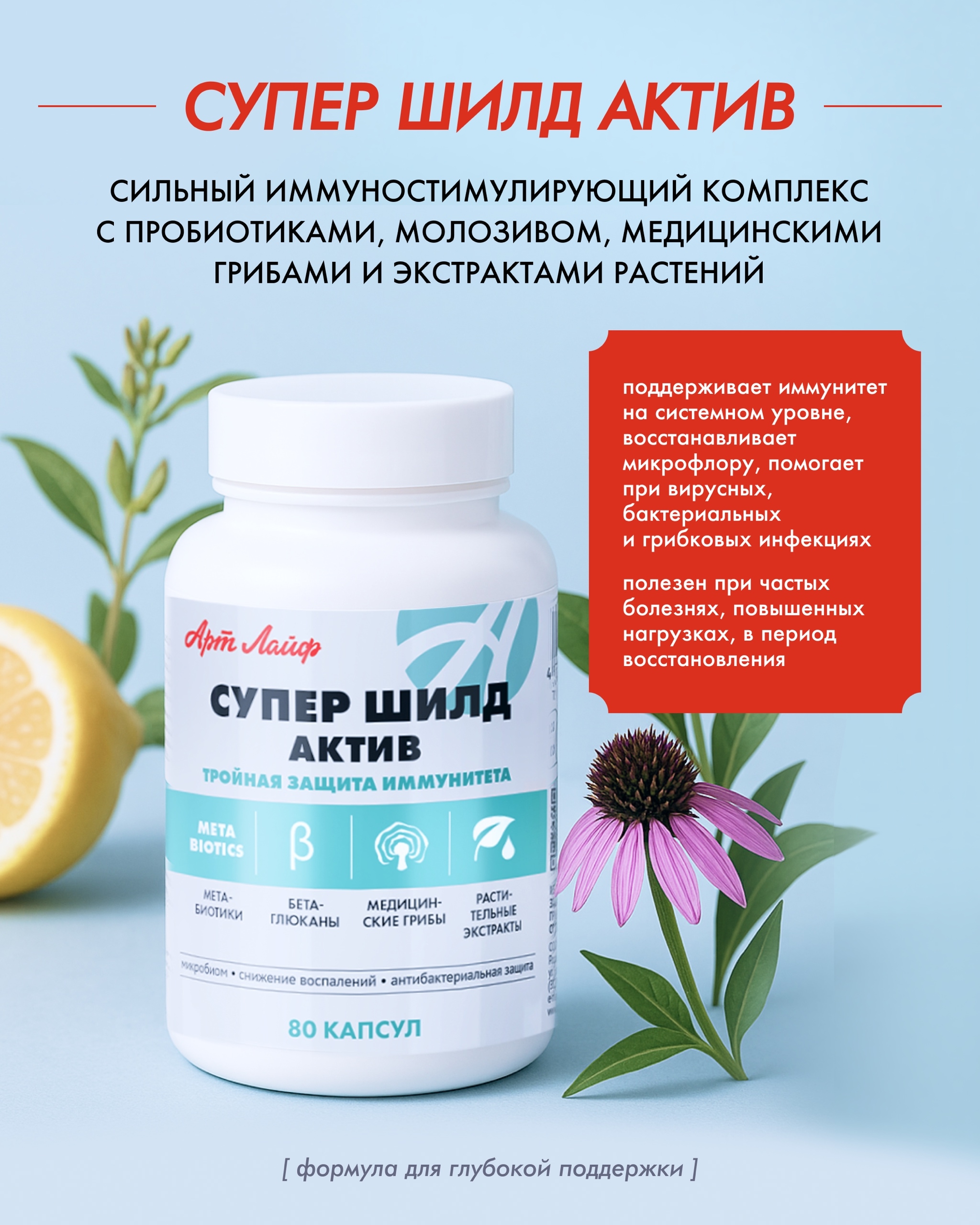 Каждый продукт Артлайф решает свою задачу: Спектр С укрепляет фундамент, ИммуЛиз защищает слизистые, Поли-Цетразин борется с инфекциями, Рудвитол активирует клеточный иммунитет, Флю-стоп+ облегчает симптомы, а Супер Шилд Актив укрепляет иммунную систему глубоко. Вместе они создают устойчивый, адаптивный и энергичный иммунитет, способный противостоять внешним стрессам и поддерживать организм в ресурсном состоянии.