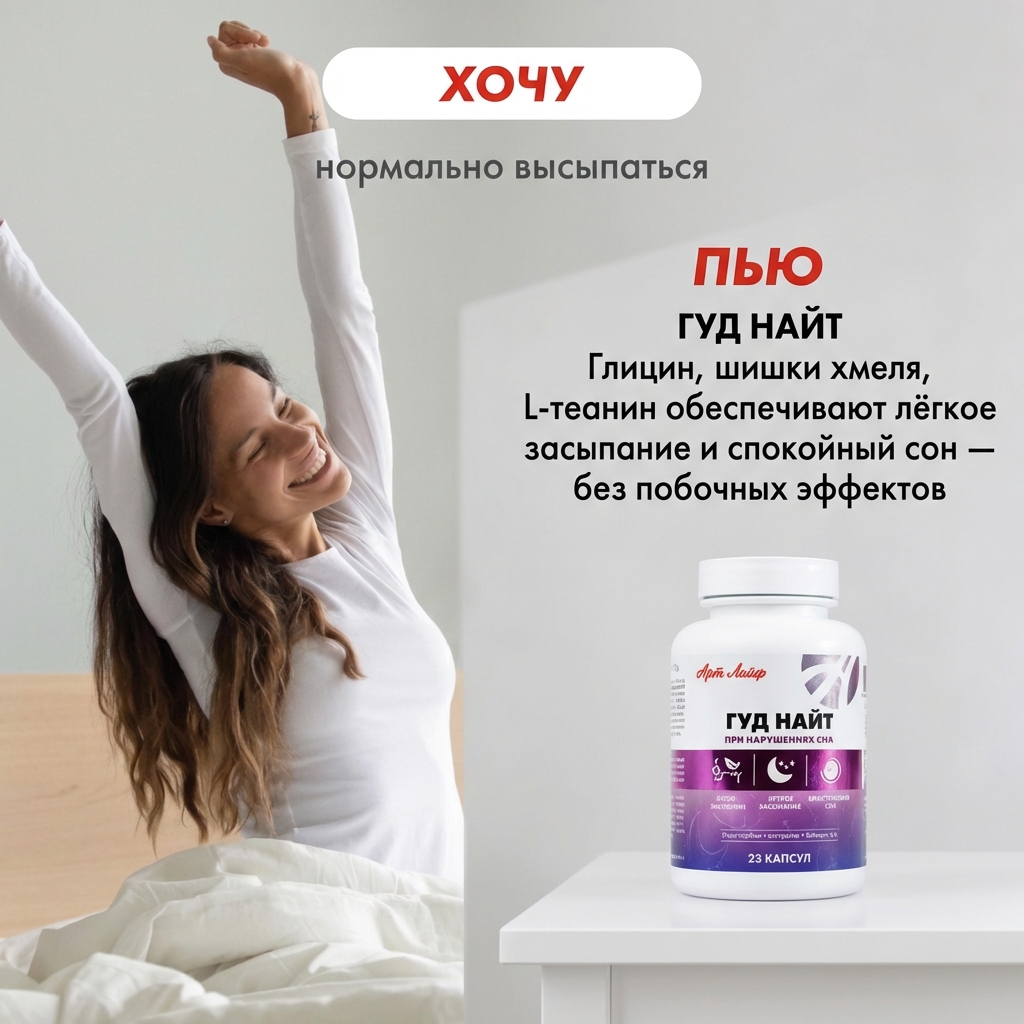 Сбалансированный состав и оптимальная дозировка комплекса Гуд Найт настраивают организм на качественный сон и поддерживают нервную систему.