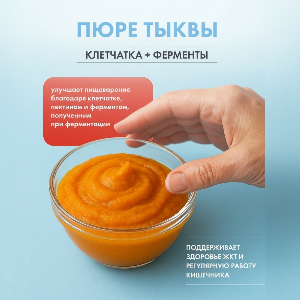 ферментированное пюре тыквы содержит большое количество ферментов, клетчатки, пектина, которые необходимы для нормального функционирования пищеварительного тракта. Поддерживает иммунитет, так как способствует выработке антител, насыщает витамином С, укрепляющим сосуды, железом, медью;