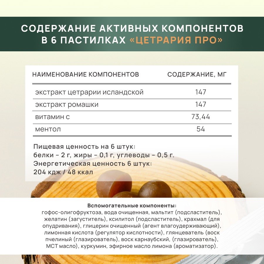 «Цетрария про» содержит цетрарию – источник усниновой кислоты. Отвечает за антибактериальный эффект широкого спектра и укрепление иммунитета.