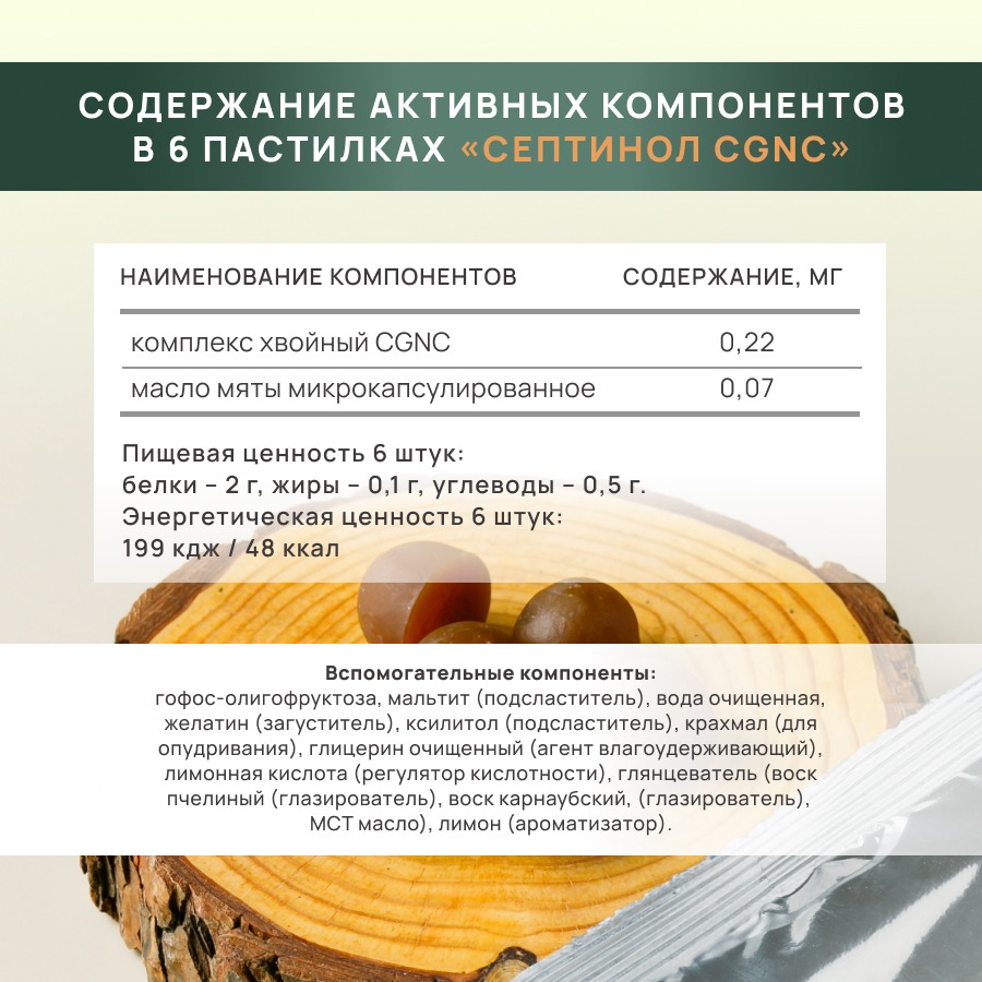 «Септинол CGNC» с богатым составом хвойного комплекса CGNC улучшает работу дыхательных путей, уменьшает воспаление, снижает интоксикацию организма.