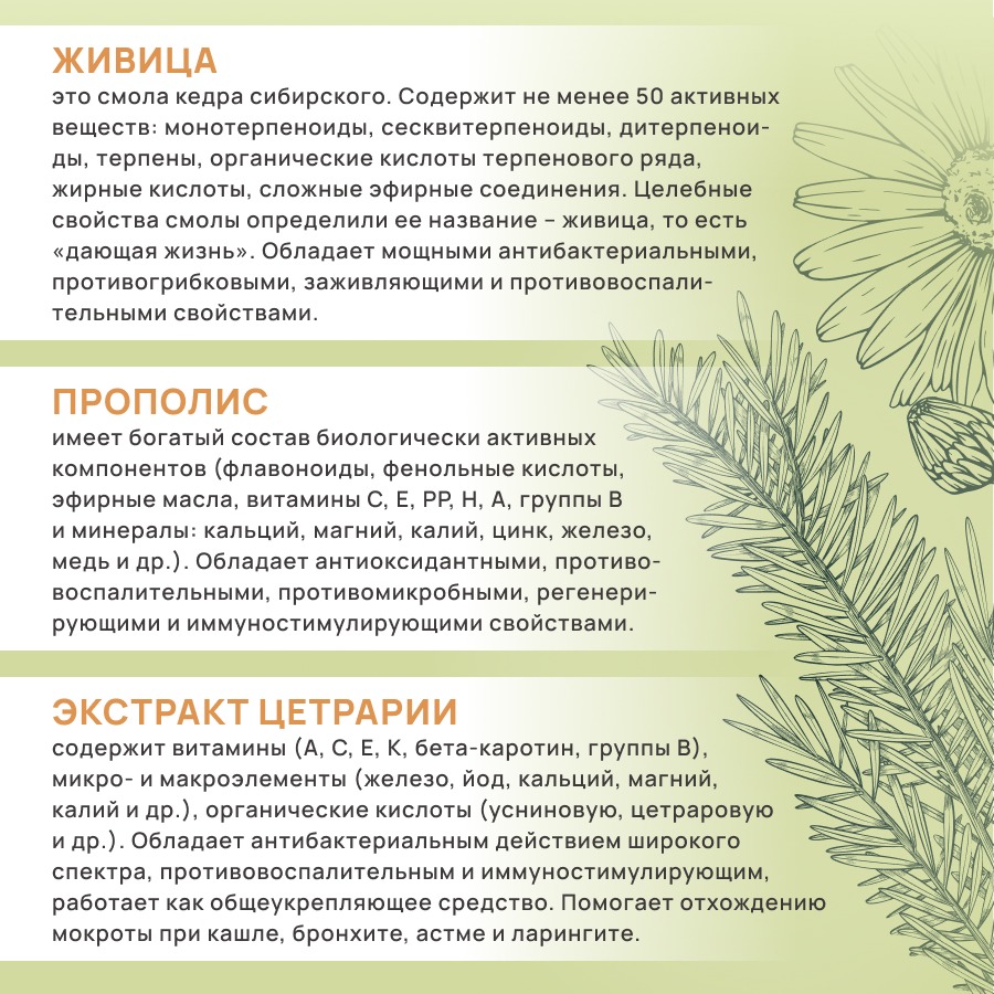 Живица – это смола кедра сибирского. Чудодейственное природное лекарство, которым раньше лечили почти все болезни. Целебные свойства смолы определили её название – живица, то есть «дающая жизнь». Она содержит не менее 50 активных веществ: монотерпеноиды, сесквитерпеноиды, дитерпеноиды, терпены, органические кислоты терпенового ряда, жирные кислоты, сложные эфирные соединения. Обладают мощными антибактериальными, противогрибковыми, заживляющими и противовоспалительными свойствами.