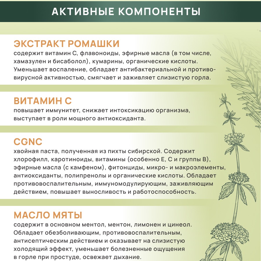 Ромашка содержит витамин С, флавоноиды, эфирные масла (в том числе, хамазулен и бисаболол), кумарины, органические кислоты. Уменьшает воспаление, обладает антибактериальной и противовирусной активностью, смягчает и заживляет слизистую горла.